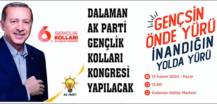 Dalaman Ak Parti Gençlik kolları 6.olağan kongresi Dalaman Belediyesi Kültür Merkezinde 15 kasım günü saat 12 de yapılacak.