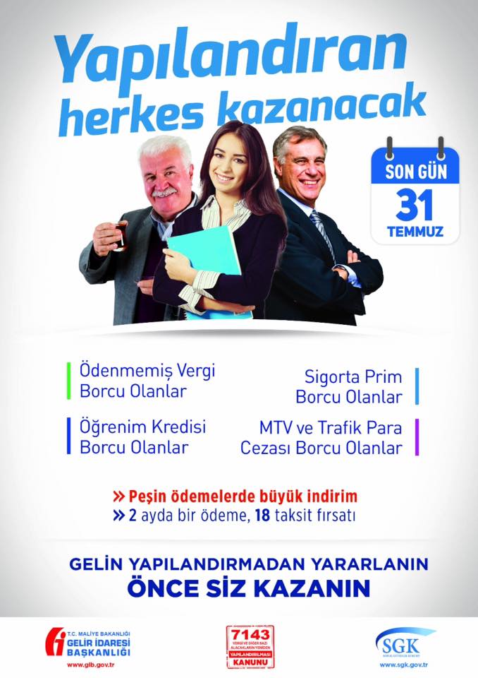 7143 sayılı Kanun, SGK’ya borcu olan İşveren, Sigortalı ve Hak Sahiplerine yeni bir fırsat daha sunuyor. Yapılandırma kapsamına sigorta primi borçları, işsizlik sigortası, sosyal güvenlik destek primi İdari para cezası, damga vergisi, Eğitime Katkı Payı, Özel İşlem Vergisi, Emeklilik Keseneği, Kurum Karşılığı borçları, işsizlik sigortası, 31 Mart 2018 tarihi önce bitirilmiş olan inşaatların asgari işçilikten dolayı çıkmış olan fark prim borçları, yine isteğe bağlı sigorta prim borçları, topluluk sigortası, üçüncü kişilerden kaynaklanan rücu alacaklarını girmektedir.
