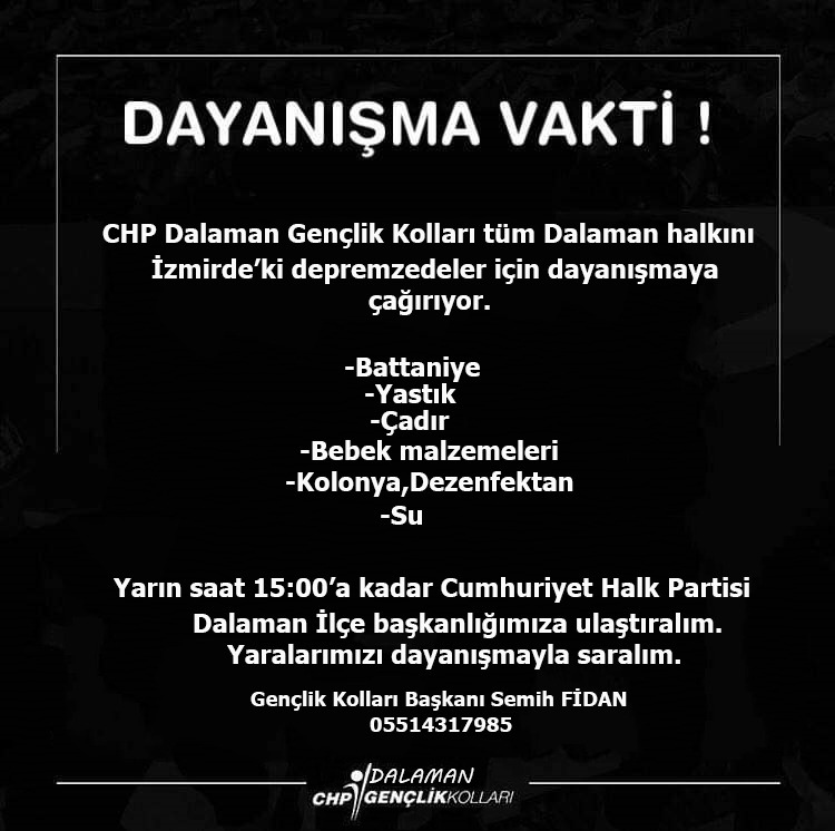 Dalaman CHP İlçe Başkanı Sezer Durmuş yaptığı açıklamada “İzmir deki depremde zarar gören vatandaşlarımıza yaralılara acil şifalar, ölenlere Allah’tan rahmet diliyoruz, bizler Dalaman CHP olarak elimizden geldiğince yardım malzemesi topladık ve ilettik, hepimize geçmiş olsun, yardımda bulunanlara da teşekkür ederiz ” dedi.Sezer ayrıca evleri hasar gören 15 ailenin Dalaman da ikamet etmesi için ilçemizde bulunan oteller 10’ar adet oda tahsis etmişlerdir dedi.