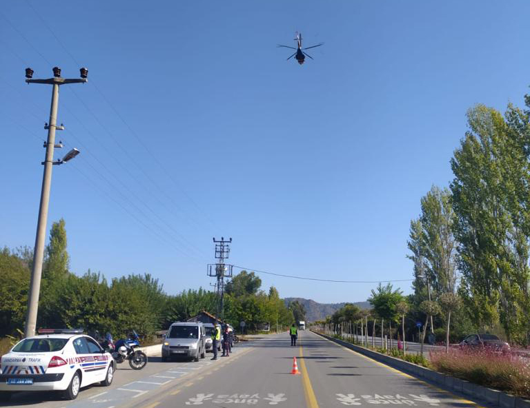 Muğla İl Jandarma Komutanlığı ve İl Emniyet Müdürlüğü ekipleri tarafından denetim faaliyetlerinin etkinliğinin arttırılarak, sürücülerde “algılanan yakalanma risk duygusunun” sürekli ve üst seviyede tutulması amacıyla, karayollarında gözlemlenen “sağ şeritte veya bankette uygunsuz durumda bekleme, ağır taşıtların uygunsuz şerit kullanımı, tehlikeli şerit değiştirme, hatalı sollama, yakın takip, karayolu üzerinde zorunlu haller dışında duraklama/ park etme gibi” ihlallerin önlenmesi maksadıyla 23 Ekim 2020 günü 10.00 – 11.00 saatleri arasında Ortaca – Dalyan Yolunda (Jandarma ve Emniyet sorumluluk sahasında) havadan trafik denetimi yapılmıştır.