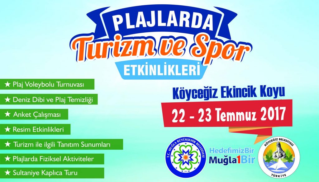 Muğla Büyükşehir Belediyesi ve Köyceğiz Belediyesi işbirliğiyle düzenlenecek olan ‘Plajlarda Turizm ve Spor Etkinlikleri’ Köyceğiz Ekincik Koyu’nda yapılacak. 22 Temmuz 2017 Cumartesi günü başlayacak olan Plajlarda Turizm ve Spor Etkinliklerinde, Plaj Voleybolu Turnuvası, Deniz Dibi ve Plaj Temizliği, Anket Çalışması, Resim Etkinlikleri, Turizm ile İlgili Tanıtım Sunumları, Plajlarda Fiziksel Aktiviteler ve Sultaniye Kaplıca Turu yapılacak.