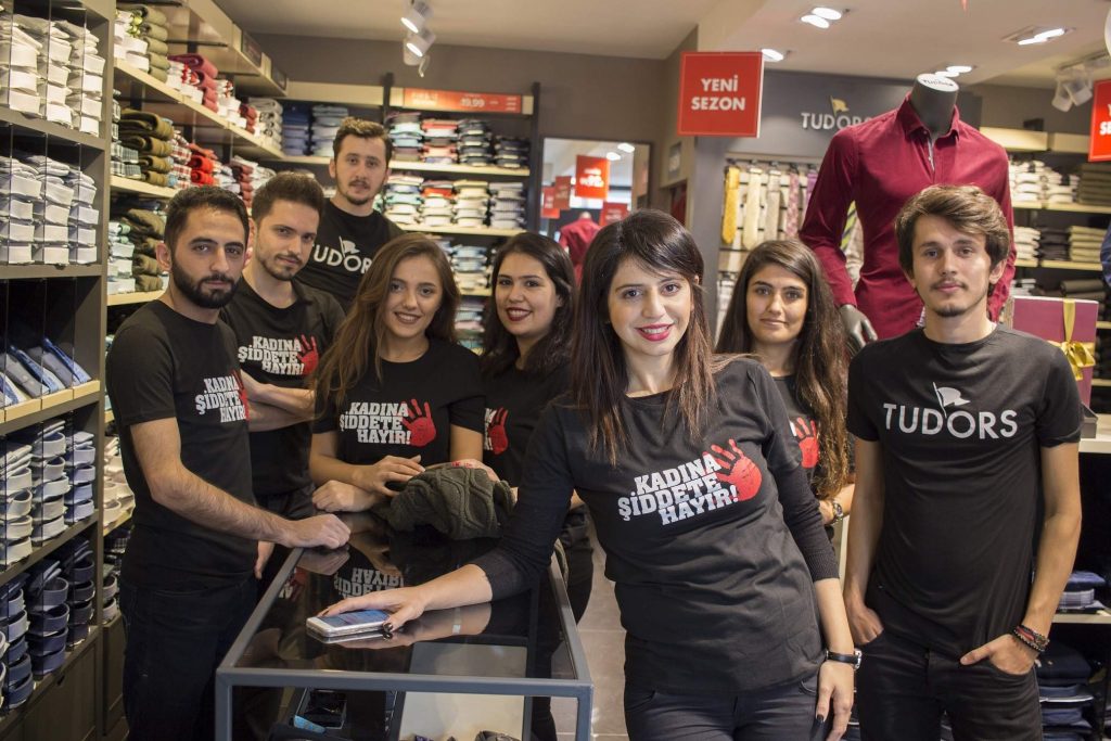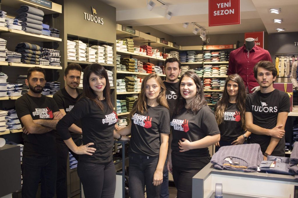 Erkek moda sektörünün öncü markası Tudors Gömlek, ‘Kadına Şiddete Hayır’ kampanyasında da öncü oldu. Tudors Gömlek, Türkiye’de 178, yurtdışında 42 olmak üzere toplam 220 mağazasıyla kadınların yanında olduğunu gösterip, erkekleri bilinçlendirmek için adım attı. Tudors Gömleğin tüm mağazalarındaki tümçalışanlar, ‘Kadına Şiddete Hayır’ yazılı tişörtleri giyip, çalışarak tüm erkeklere toplumsal mesaj verdi. Tudors Gömlek CEO’su Yaşar Ayaydın, kadına yönelik her türlü şiddete karşı farkındalık yaratarak dikkat çekmeyi hedeflediklerini belirterek şunları söyledi: ‘Erkek moda dünyasında yer alan bir marka olarak kadına yönelik şiddet konusunda erkekleri bilinçlendirmek ve dikkatlerini çekmek için tüm mağazalarımızda ve merkez binamızda tüm personelimiz ‘Kadına Şiddete Hayır’ tişörtleriyle hizmet verdik. Mağazalarımızdaçalışan tüm erkek ve kadınlar birlikte el ele toplumsal bir mesaj verdi. Bu bizi ve çalışanlarımızı çok heyecanlandıran, toplumsal bir duruş oldu. Müşterilerimizin çok ilgisini çeken bu davranışa ortak olmak için birçok kişi aynı tişörtlerden satın almak istedi ve inanılmaz büyük bir duyarlılıkla karşılaştık. Amacımız kadına ve her türlü canlıya karşı şiddete dur demek. Bir erkek markası olarak erkeklere sesleniyoruz, kadına yönelik şiddete hayır diyoruz. Bu bizim için ilk adım oldu. Bu bilinçlendirme hareketimizi bir üst noktaya taşıyarak tüm Türkiye’deki tüm tüketicilerimizle büyük farkındalık yaratarak, şiddete hayır dedirtmek istiyoruz.’