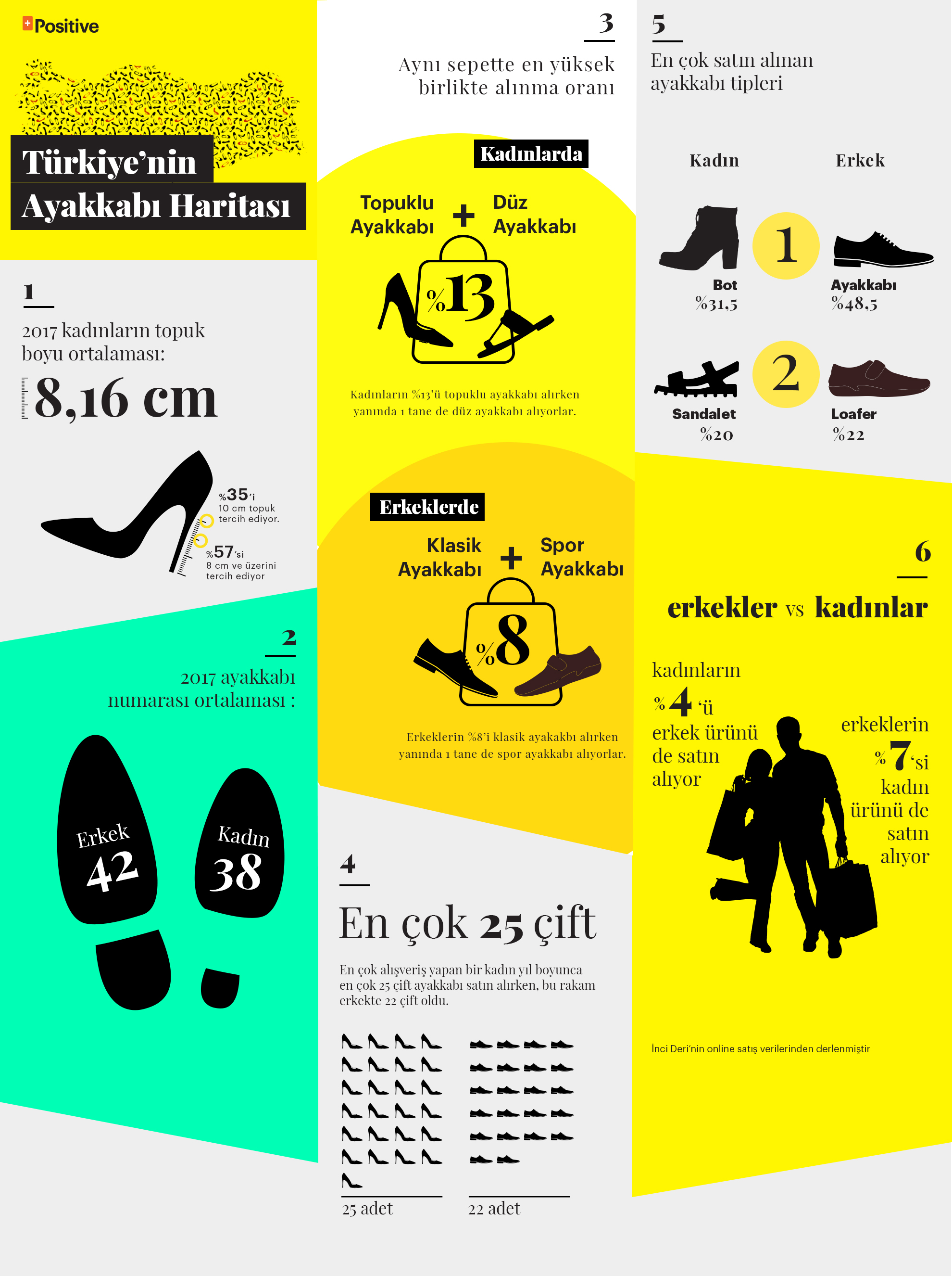 Positive’in İnci Deri’nin online satış verilerinden derlediği bilgilere göre, kadınlarda en çok satılan ayakkabı numarası 38, erkeklerde ise 42. 2017 yılında gerçekleşen satışları baz alan veriler arasında, ayakkabı alışverişlerinin yüzde 63’ünü kadınların yaptığı, 100 kadından 13’ünün topuklu ayakkabı satın alırken bir çift de düz ayakkabı satın aldığı gibi dikkat çekici bilgiler yer alıyor.